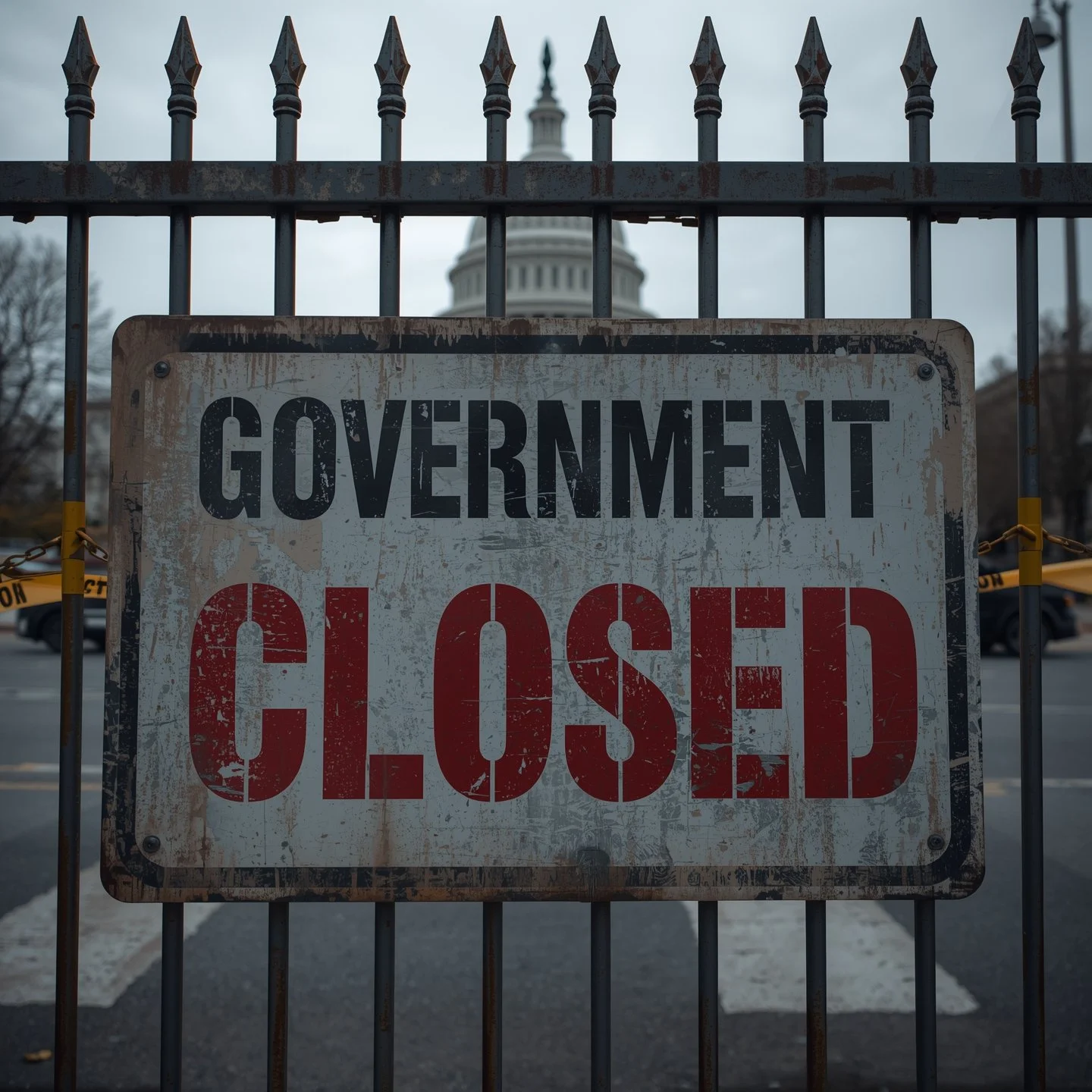 A weathered metal sign reading "Government Closed" is attached to a black iron fence, with the U.S. Capitol building blurred in the background.